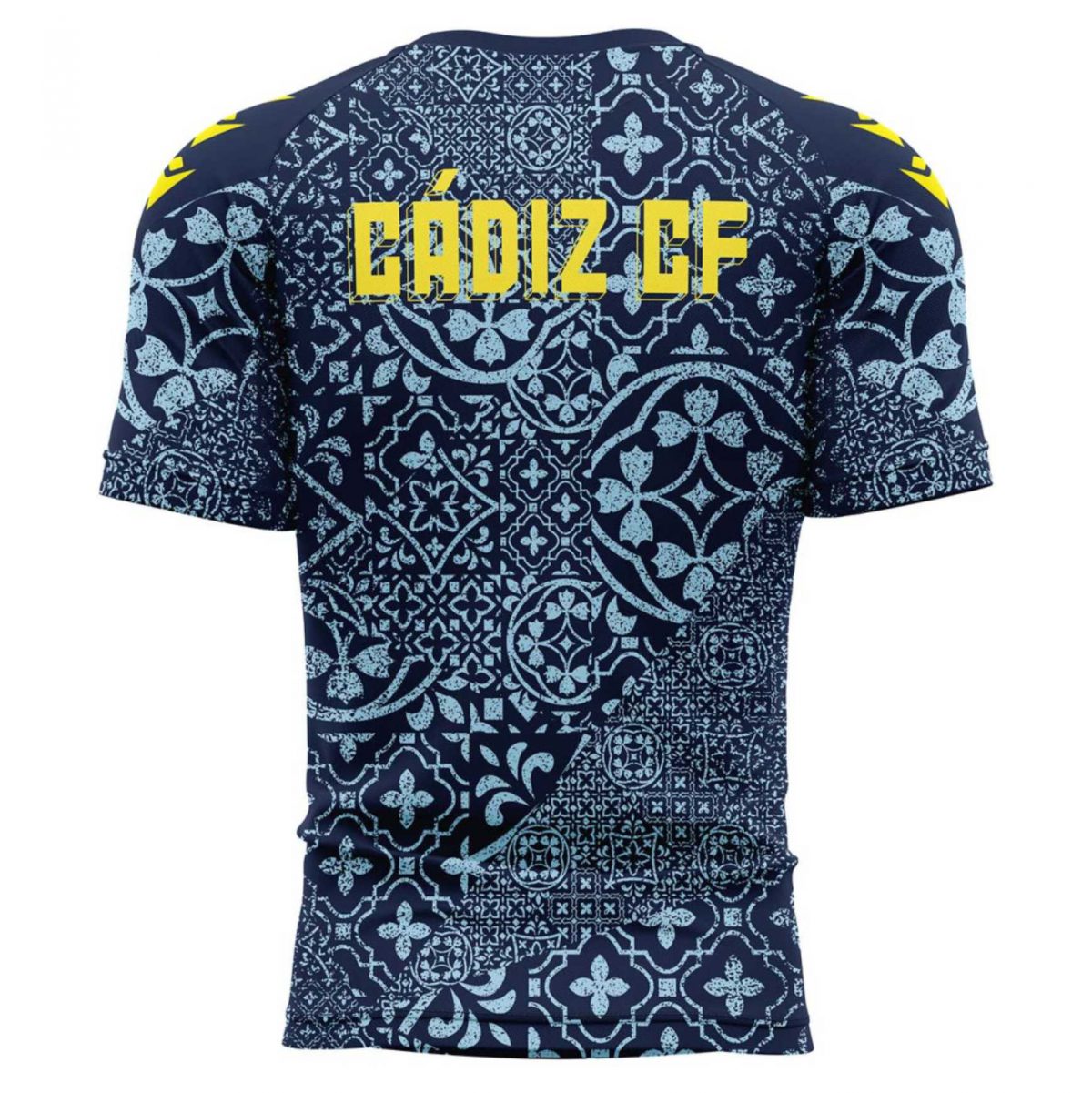 El diseño destaca por un patrón gráfico en tonos azul marino y celeste inspirado en motivos geométricos, aportando un toque moderno y diferenciador. En el pecho, el escudo del Cádiz CF bordado y el logotipo de Macron certifican que se trata de un producto oficial de la temporada 2025/26.